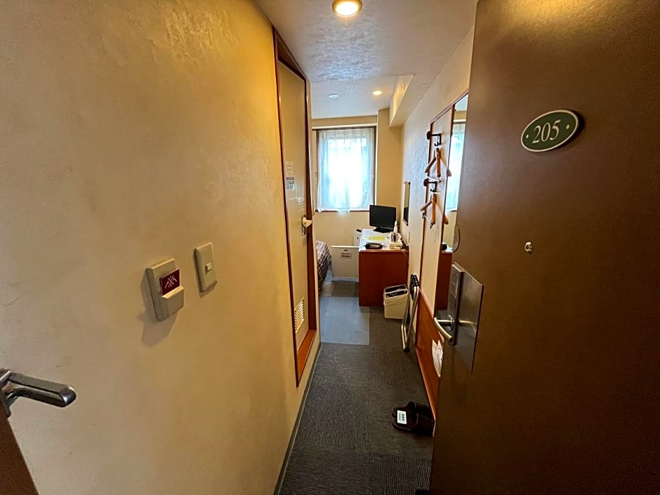 Features a semi-double bed (47 in wide). Room comes with an private bathroom, a fridge and an electric kettle with green tea bags. Japanese Yukata robes and toothbrush sets are provided for all guests. Room has no AC.